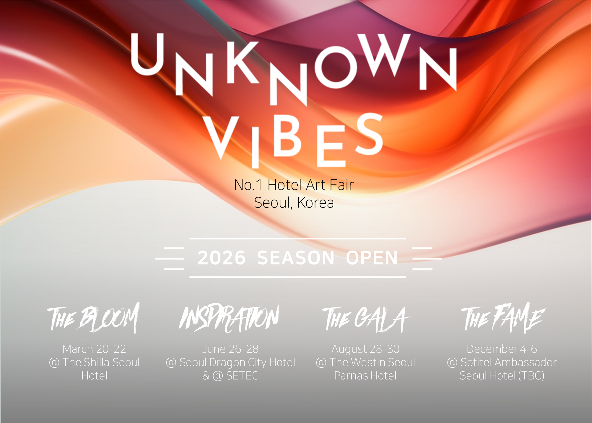 예술은 1년에 한 번 열리는 연례 행사가 아니라, 일상 속에서 숨 쉬어야 하는 ‘라이프스타일’이기 때문입니다. 이미 2025년에 세 차례의 아트페어 개최 경험을 쌓았습니다. 2026년 시즌은 3월 서울신라호텔(The BLOOM), 6월 서울드래곤시티호텔(INSPIRATION), 8월 웨스틴서울파르나스호텔 (The GALA), 12월 소피텔앰배서더서울호텔(The FAME, 협의 중) 등 사계절의 특성과 장소의 무드에 맞춰 기획되었습니다. 이는 단순히 횟수를 늘린 것이 아닙니다. 관람객에게는 연중 끊임없는 다채로운 아트 경험을, 작가와 갤러리에게는 1회성이 아닌 지속적인 브랜딩과 세일즈의 무대를 제공하기 위함입니다.