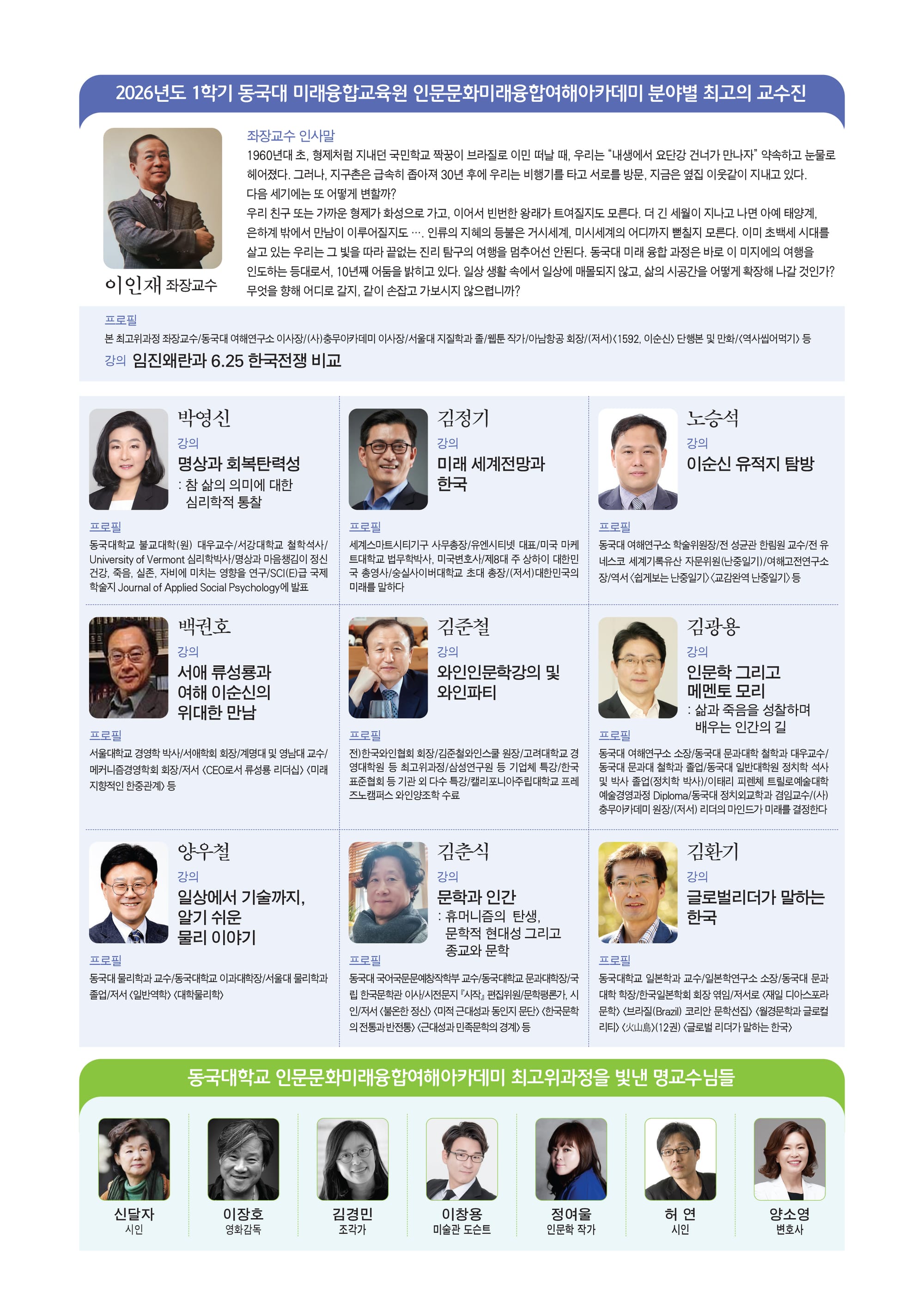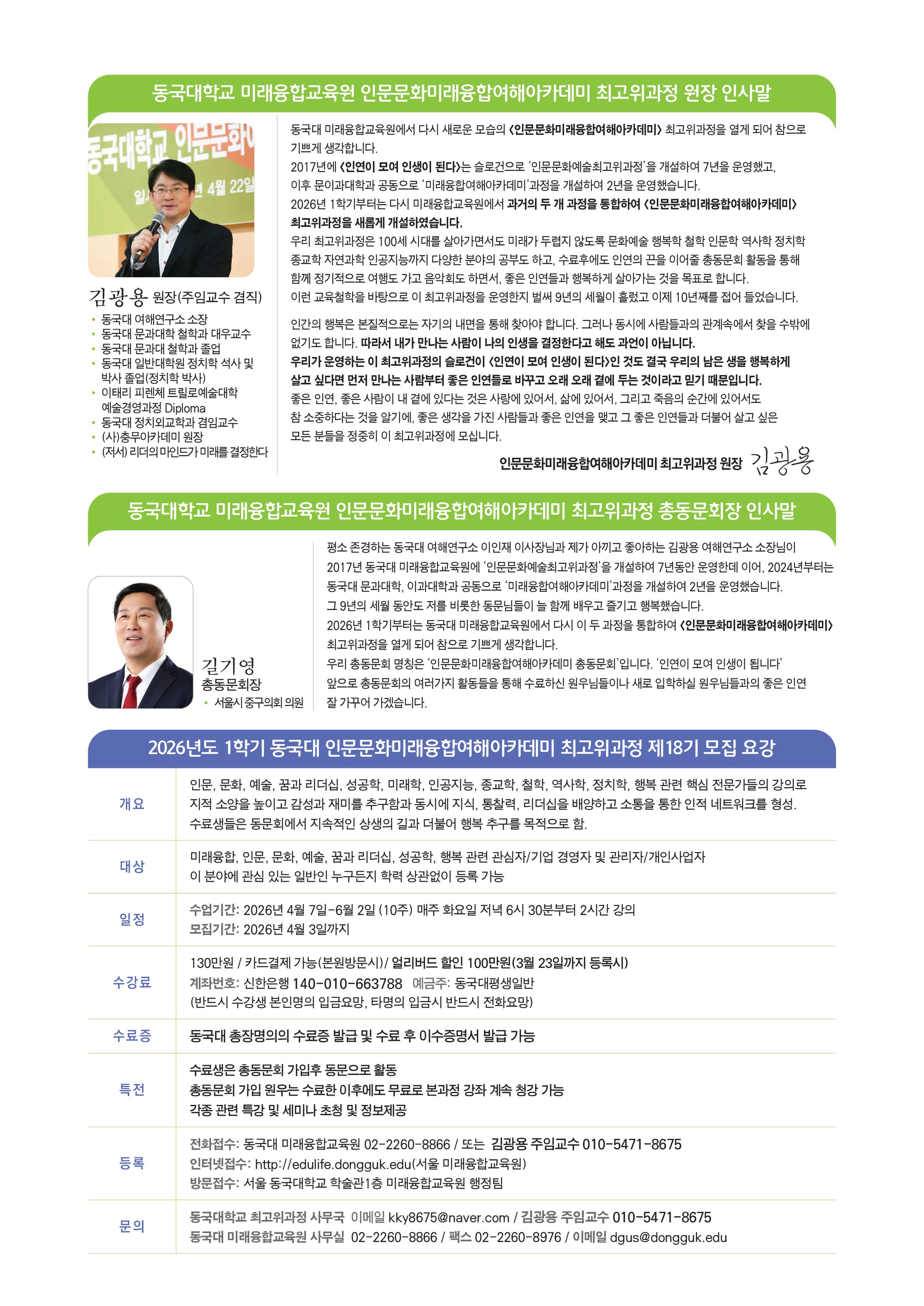 김광용 동국대 미래융합교육원 ‘인문문화미래융합여해아카데미’ 원장은 2026년 1학기부터 미래융합교육원에서 <인문문화미래융합여해아카데미> 최고위과정을 새롭게 개설 운영한다.