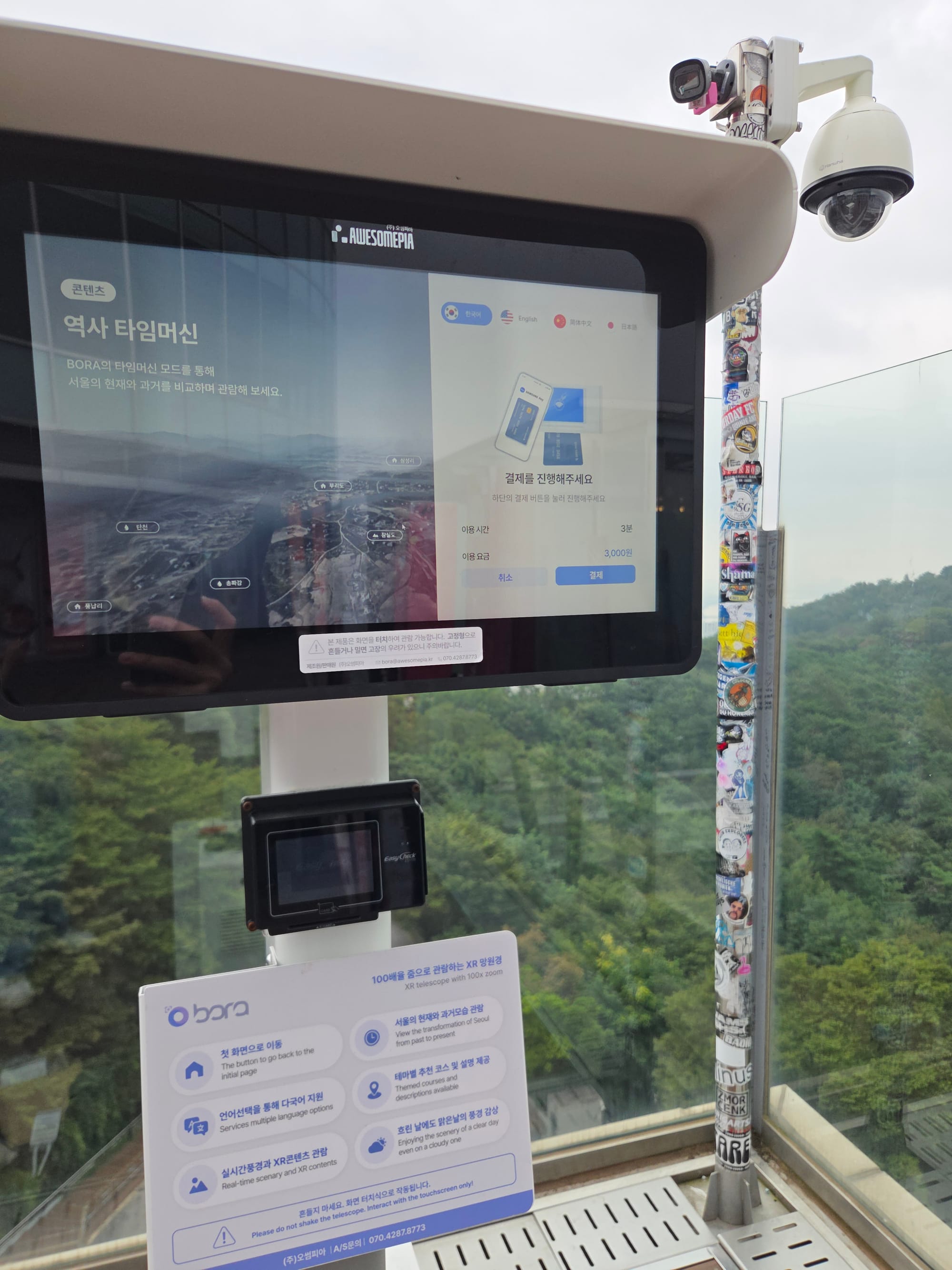 그래서 저희는 이 공간을 완전히 새로운 디지털 경험의 창(Window)으로 바꾸기로 결심했습니다. BORA의 가장 결정적인 차별점은 현재 눈앞의 풍경을 단방향 광학 렌즈로 보여주는 데 그치지 않고, AI(인공지능)와 XR(확장현실) 기술을 융합해 '과거와 현재, 물리적 기상의 한계를 완전히 초월하는 시공간의 확장'을 이뤄냈다는 것입니다. 예를 들어, 엄청난 기대감을 안고 타워에 올라간 외국인 관광객이 짙은 안개나 미세먼지로 인해 뷰를 전혀 보지 못한다면 그 실망감은 이루 말할 수 없습니다. 이는 타워 운영사의 치명적인 리스크입니다. 하지만 BORA는 데이터 기반의 고해상도 '맑은 날 버전(Clear Day Simulation)'과 춘하추동 계절 선택 기능을 즉각 제공하여 기후 조건에 전혀 구애받지 않는 최상의 조망 경험을 보장합니다. 더 나아가, 화면 속 피사체를 인식하여 4개 국어(한·영·일·중)로 맥락을 설명해 주는 AI 휴먼 가이드 기능, 그리고 현재는 사라진 역사적 건축물이나 문화유산을 AR로 그 자리에 오버레이(Overlay)하여 에듀테인먼트를 제공하는 기능은 스마트폰이나 기존 망원경이 결코 흉내 낼 수 없는 오썸피아만의 독보적인 가치이자, 공간 컴퓨팅 시대의 진정한 킬러 앱(Killer App)입니다."